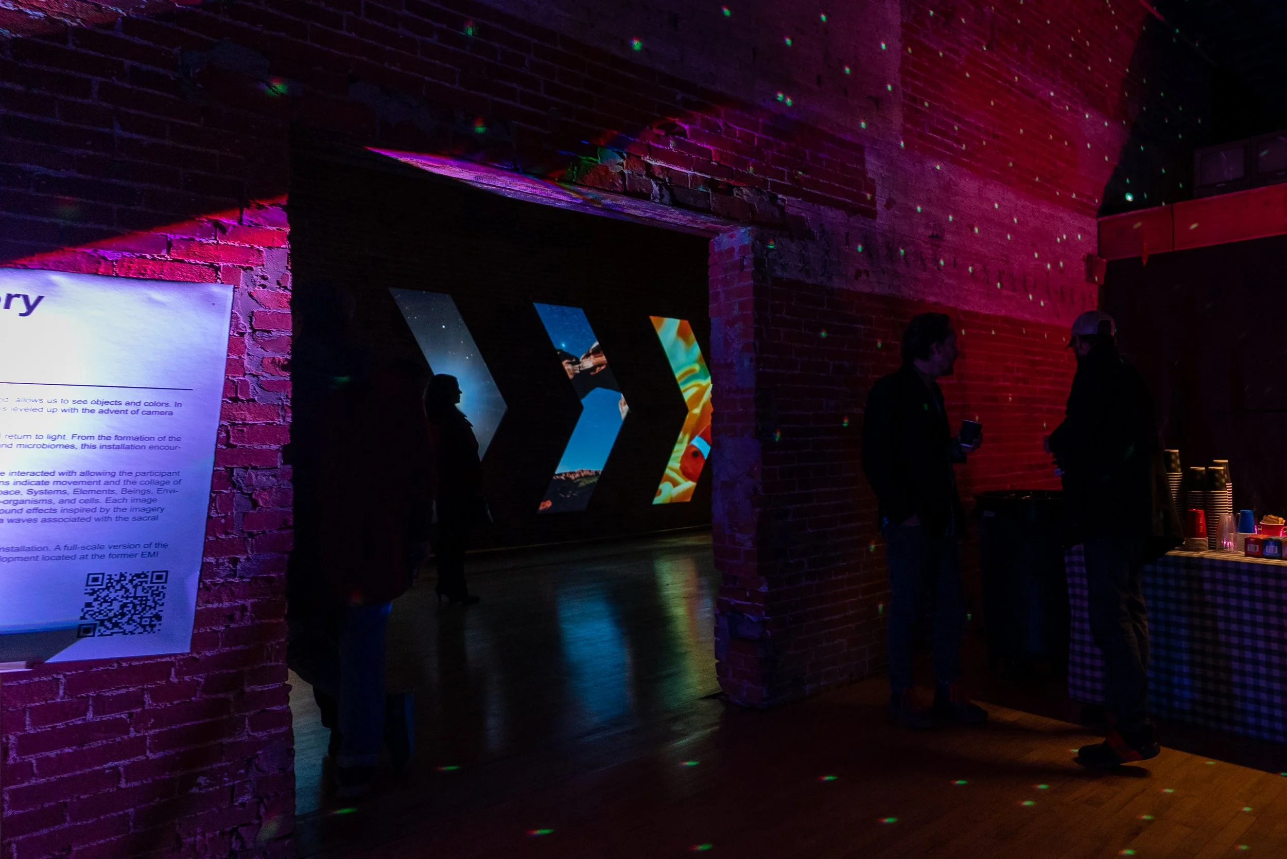 The inspiration behind the imagery of this installation contemplates different forms of light and its role in a natural cycle of creation and destruction. From both a scientific and spiritual theory, everything that exists comes from light and will return to light. When walking through this installation, you will explore themes such as the formation of the universe governed by the speed of light to the deaths and rebirths of galaxies and microbiomes.